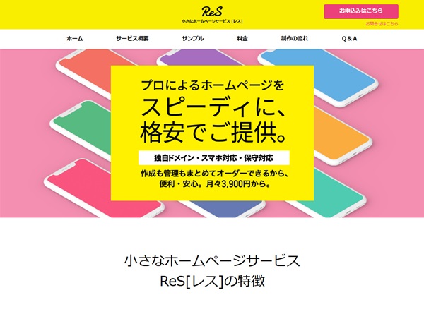 | 紹介文 | ReS[レス]は、 『Re;newal』 スマホ標準対応で流行りのデザインに! 『Re;start』 止まっていたホームページ・事業を再スタートしませんか? 『S;imple』 手軽に作れます!デザインもシンプルに! 『S;mall』 小さな規模でも大丈夫! 『Res;ponse』 お客様からの反応があるサイトに! をコンセプトに、リーズナブルで質の高いWebサイト制作パッケージを提供しています。より規模の大きいサイト、機能の豊富なサイト、オリジナリティの高いデザイン、トータルなサイトディレクションをご希望のお客様にはフルオーダーメイドの制作サービスも承ります。WordPressサイトの構築もお任せ下さい。 |